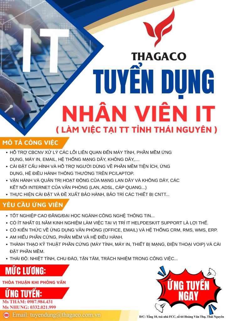 Nhằm đáp ứng nhu cầu mở rộng và nâng cao năng lực vận hành hệ thống, THAGACO cần tuyển Nhân viên IT làm việc tại tỉnh Thái Nguyên.